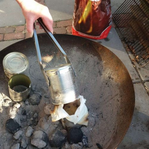 - Zet over elk ½ liter blikken een literblik met bodem naar boven. Veeg de gloeiende kooltjes weer terug tegen de blikken aan en schep wat gloeiende kooltjes boven op de blikken.