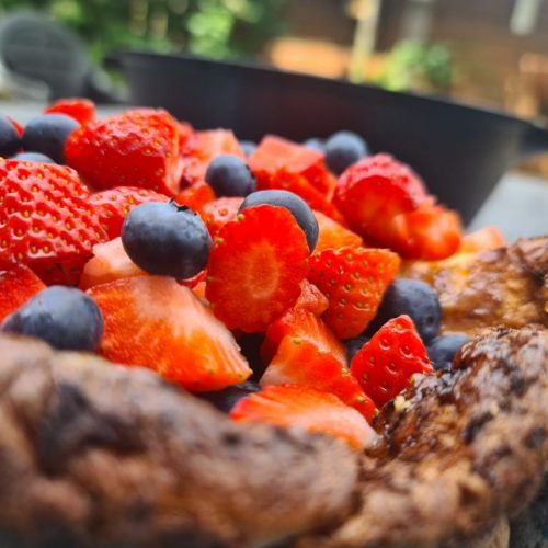 Hoog tijd dat de buitenkokers aan de Dutch Baby gaan. Dit vooral ook omdat ook in de binnen versie van dit recept de Dutch Baby in gietijzer gebakken wordt.