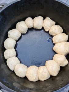 - Plaats direct na het opbollen je deegballetje aan de rand van de Dutch Oven en vorm zo een ring van deegballetjes. Smeer de deegballetjes in met een dun laagje olie en zet deze afgedekt warm weg om te rijzen. Bijvoorbeeld een Dutch Oven met in de inter één of twee gloeiende briketjes op het deksel. Laat het brood zo minimaal dertig minuten rijzen.Tijdens de Tweede rijs is het tijd om de vulling te gaan maken.